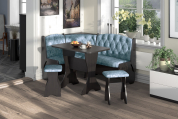Набор мебели для кухни с классической красивой каретной стяжкой, включающий в себя угловую скамью, стол и два табурета. В угловой скамье под сиденьями расположены два ящика. Каркас выполнен из ЛДСП. Покрытие верхней части столешницы стола - термостойкий пластик, кромка ПВХ – 1 мм. Углы столешницы закруглены для избегания травмирования и придания лучшего эстетического вида.