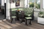 Набор мебели для кухни с классической красивой каретной стяжкой, включающий в себя угловую скамью, стол и два табурета. В угловой скамье под сиденьями расположены два ящика. Каркас выполнен из ЛДСП. Покрытие верхней части столешницы стола - термостойкий пластик, кромка ПВХ – 1 мм. Углы столешницы закруглены для избегания травмирования и придания лучшего эстетического вида.